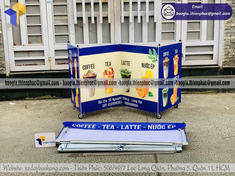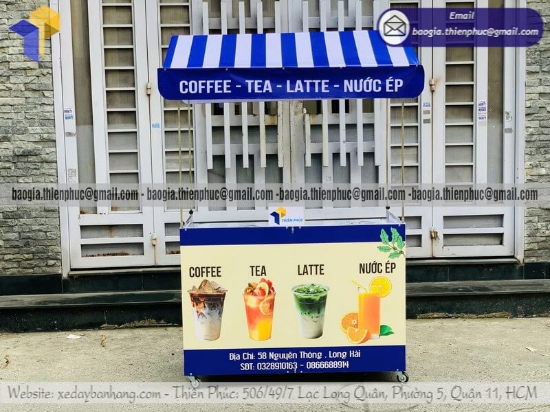 Tên sản phẩm: Báo giá quầy bán nước ép dạo lắp ráp lưu động có bánh xe với logo COFFEE-TEA-LATTE-NƯỚC ÉP